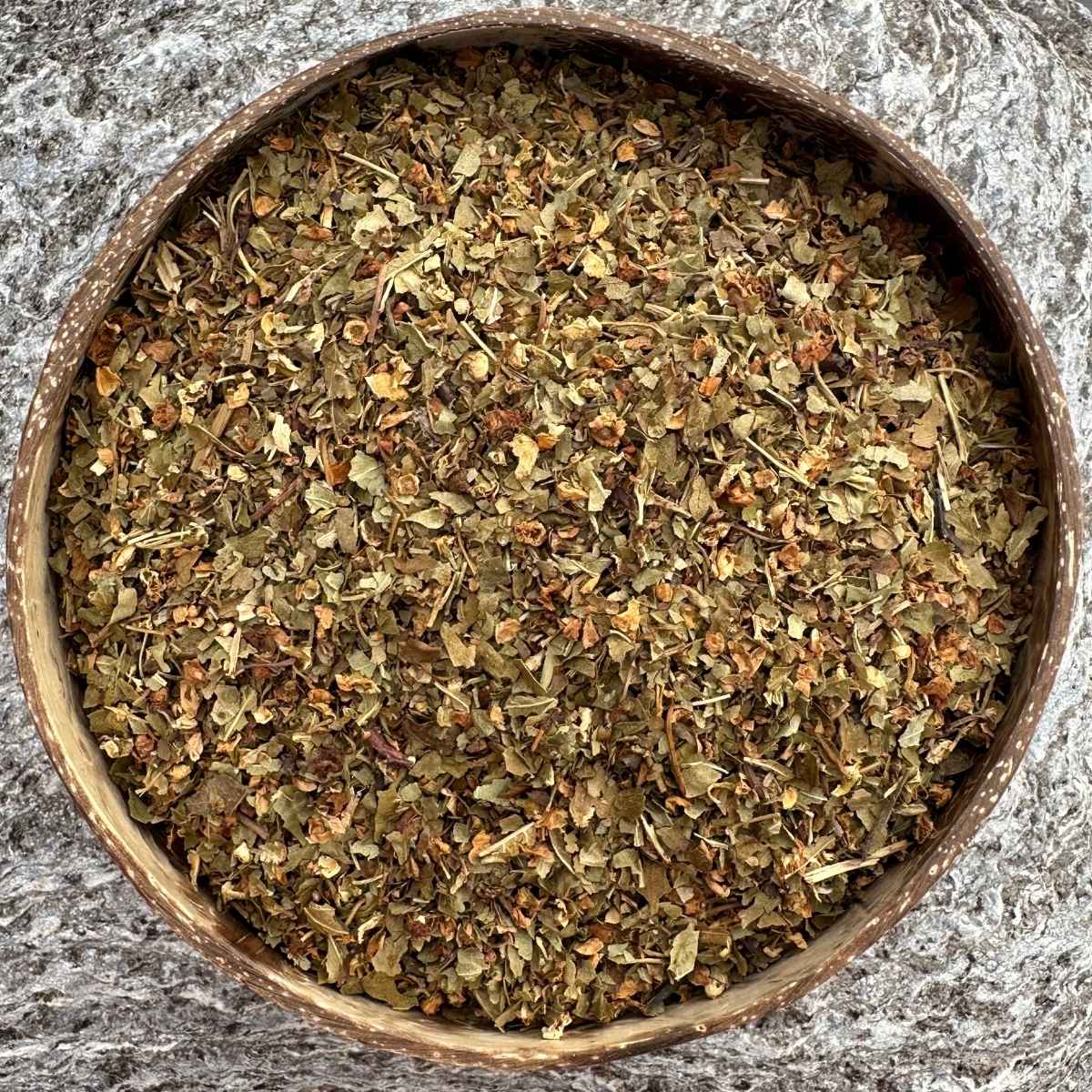Organic hawthorn leaf and flower, cut and sifted, ideal for gentle herbal teas and traditional blends.